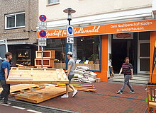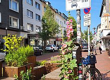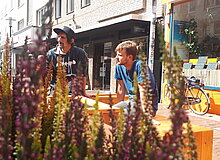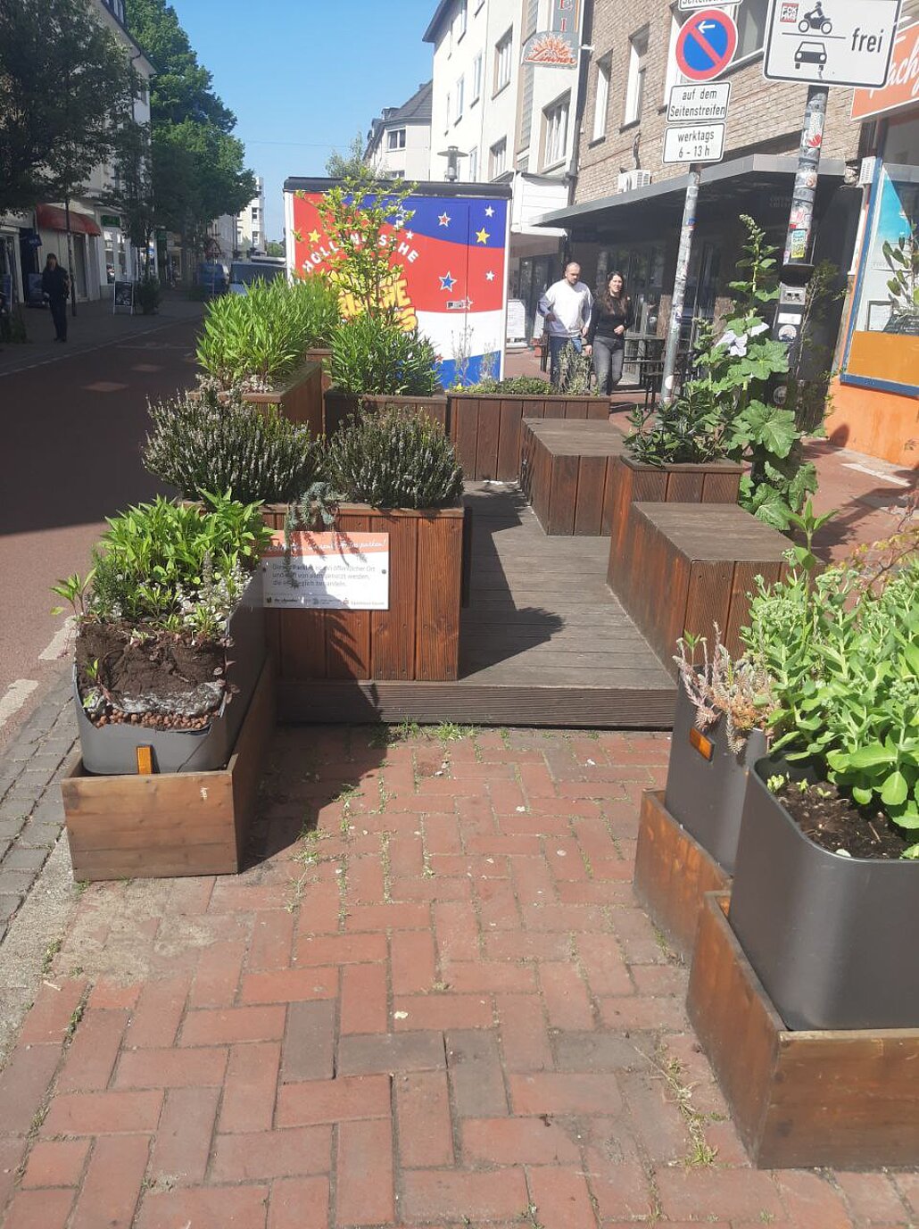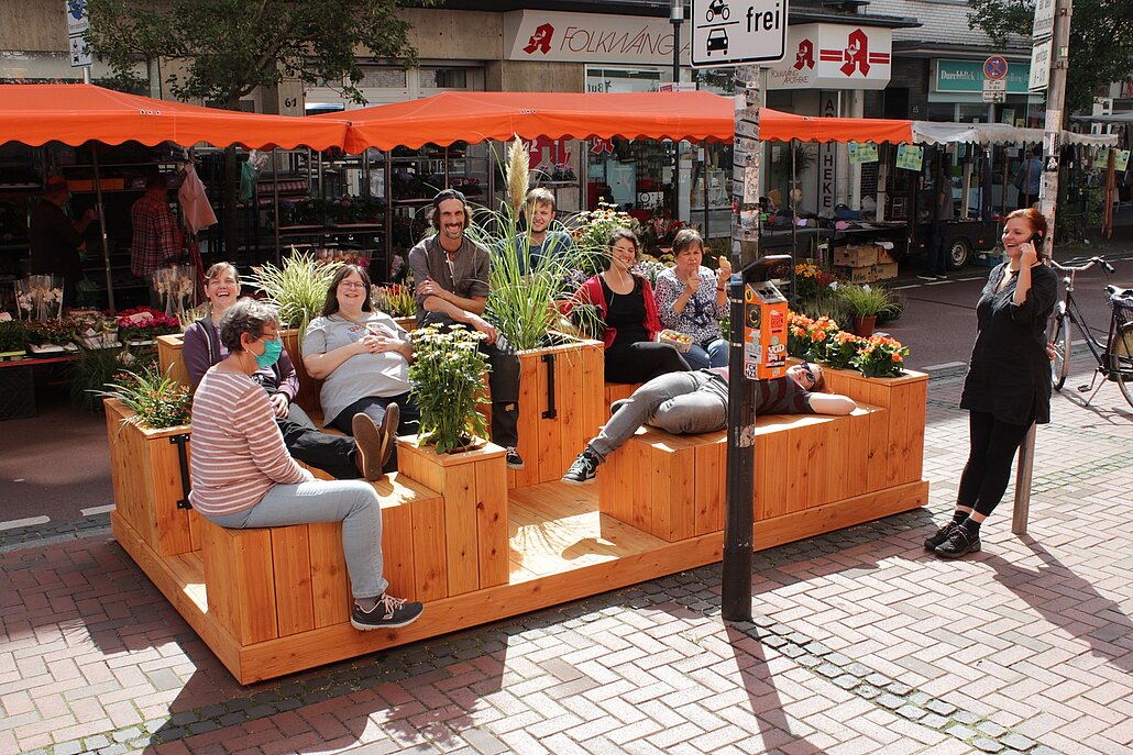 Wir wollten den Parkplatz vor dem Stadtteilladen als Aufenthaltsfläche den Menschen zurückgeben. Wir haben also aktiv eine große begrünte Sitzbank gebaut, die wir aufwendig von der Stadt als "Sondernutzung" genehmigen lassen mussten. Das Parklet war somit eines der ersten urbanen Sitzmöbel in NRW und steht seit über fünf Jahren in der Einkaufstraße, bisher sogar nahezu Vandalismusfrei. Einmal wurden Pflanzen geklaut, umgehend wurden dann neue Pflanzen aus der Nachbarschaft gespendet, damit die Pflanzkästen wieder blühen.