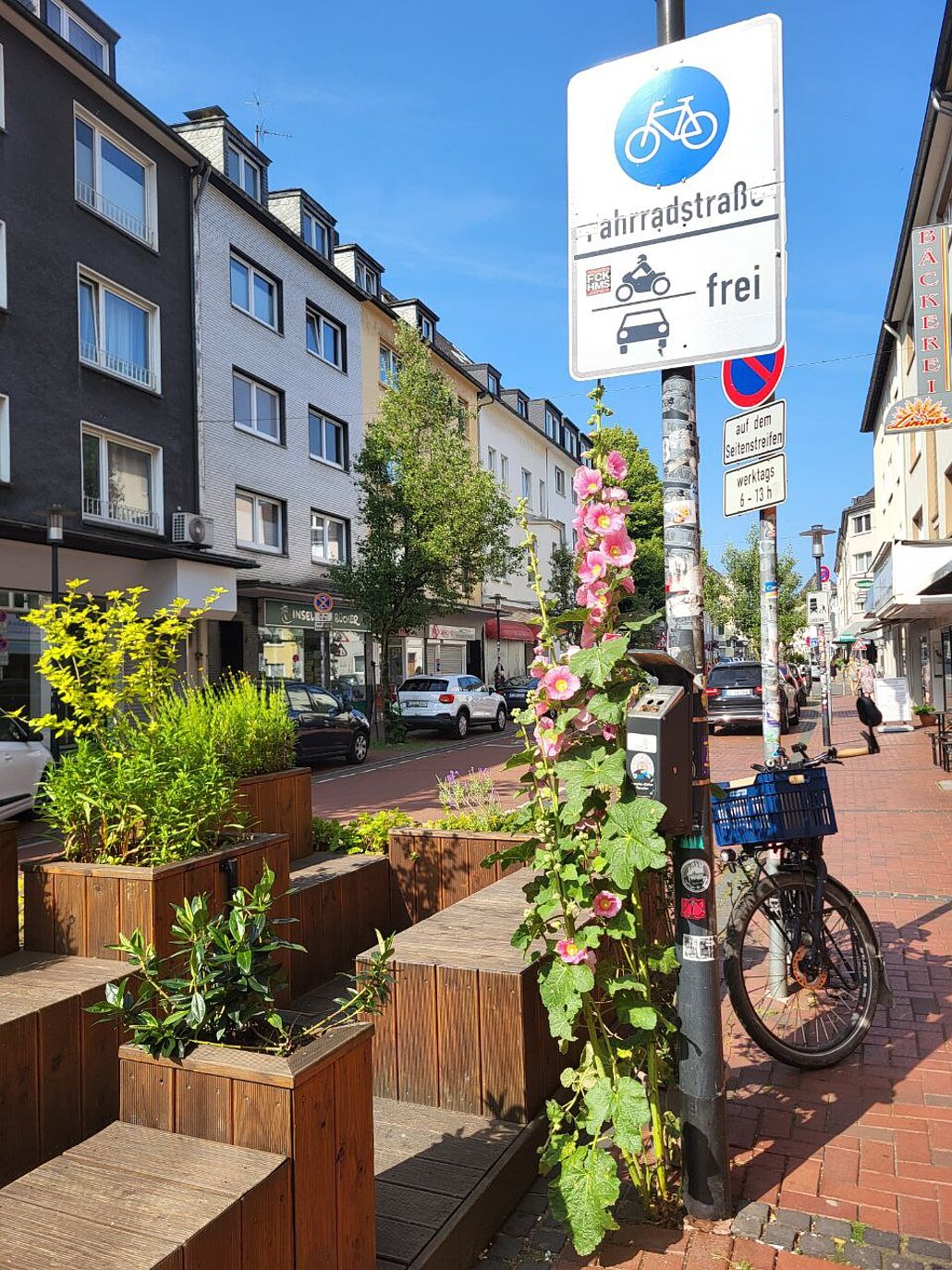 Angepflanzt sind neben kleinen Sträuchern auch Gewürze, Obst und Blumen. Es duftet also in der Straße, manchmal kann man sogar Minze naschen oder am Lavendel riechen. Als Sonnenschutz sind bei geöffnetem Stadteilladen Sonnenschirme aufgestellt und es liegen Sitzkissen. Kunden der benachbarten Gastronomien snacken hier Mahlzeiten und Senioren pausieren bei Spaziergängen. Regelmäßig finden wir zusätzlich "Blumentöpfe" die dort als grüne Gesellschaft "ausgesetzt" werden, die aber oft auch einfach wieder verschwinden.