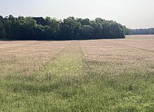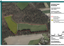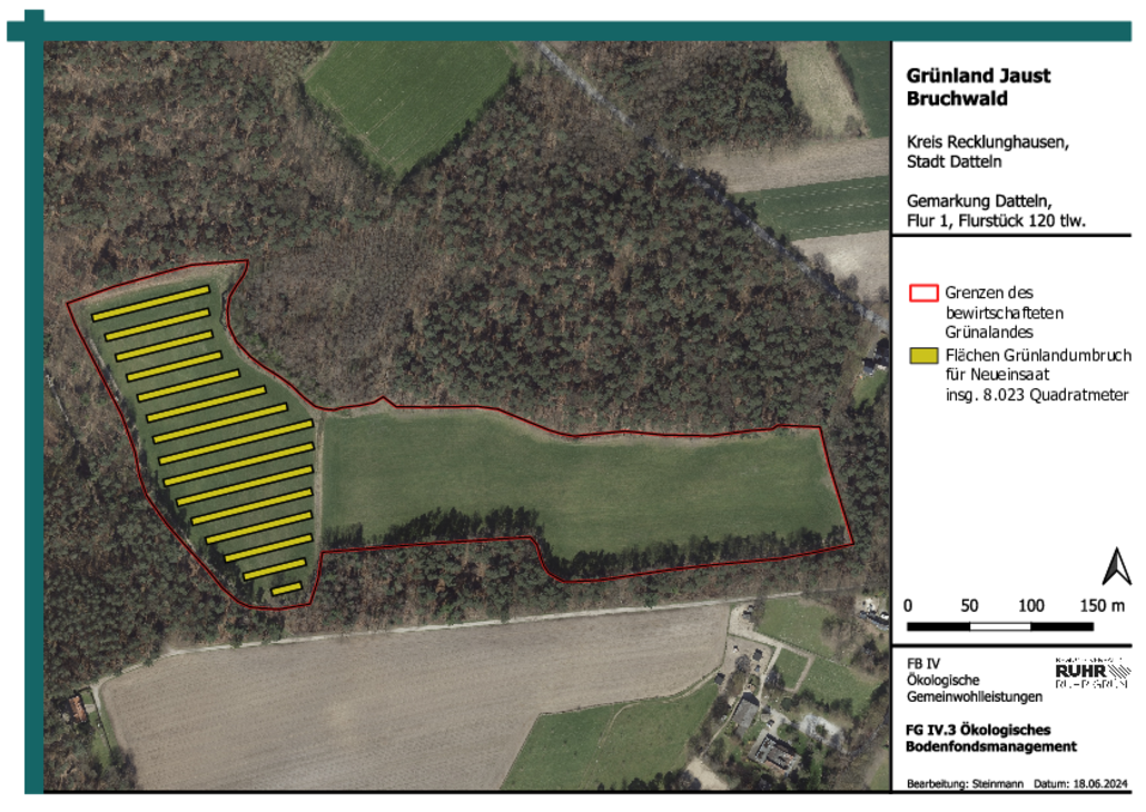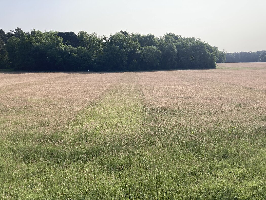 Auf einem ehemaligen Ackerstandort hat sich in den letzten Jahren ein artenarmes, intensiv genutztes Grünland etabliert. Bereits vor mehreren Jahren wurde durch entsprechende Bewirtschaftungsauflagen in Abstimmung mit dem zuständigen Landwirt beispielsweise auf jegliche Art von Düngung und Pflanzeschutzmitteln verzichtet. Wo vorher Mais stand, ist der Boden sehr nährstoffreich. Diese Nährstoffe mussten erst einmal durch häufiges Scheiden der Wiese runter von der Fläche. So wurden nach und nach die Voraussetzungen für eine Grünlandanreicherung und eine extensive Bewirtschaftung geschaffen. Im Jahr 2024 wurde der erste Teil der Fläche angereichert, für den weiteren Verlauf des Jahres 2025 ist der zweite und letzte Teil geplant. Dazu wurden insgesamt 15 Streifen angelegt, in denen das bestehende artenarme Grünland umgebrochen wurde. Diese Streifen wurden dann mit einer auf den Standort abgestimmten Saatgutmischung zertifizierter Regiosaatguthersteller wieder eingesät. Aus den so sehr artenreichen Streifen wird sich in den folgenden Jahren durch die extensive Bewirtschaftung der Fläche der Artenreichtum weiter verteilen. Diese Maßnahme ist im Jahr 2025 ebenfalls auf dem zweiten Flächenteil geplant.