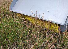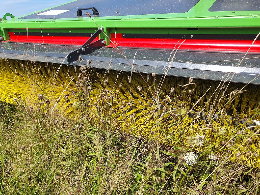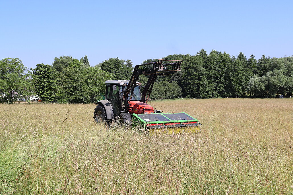 Zur Gewinnung, Sicherung und Vermehrung von streng autochthonem Saatgut der letzten artenreichen Wiesen im Ruhrgebiet wurden zwei Erntegeräte des Typs „Wiesefix“ im November 2022 beschafft. Auf den Spenderflächen des Mülheimer Aubergs wurden im Sommer 2023 bislang rund 50 kg autochthones Saatgut gewonnen. Bei den Glatthaferwiesen konnten die Zielarten Wiesen-Margerite, Ruchgras, Kammgras, Sauerampfer, Scharfer-Hahnenfuß, Wiesen-Flockenblume und Hornklee mit vielen „Beifängen“ begleitender Arten des FFH-Lebensraumtyps 6510 gewonnen werden. Das Saatgut wird auf geeigneten Flächen im Naturraum Rheinisches Bergland ausgebracht. Neben der Saatgutgewinnung auf dem Auberg fand ebenfalls eine Beerntung von Glatthaferwiesen im Kreis Recklinghausen durch die dortige untere Naturschutzbehörde statt. Das hier gewonnene Saatmaterial wird in selben Naturraum (Westdeutsches Tiefland) auf geeigneten Flächen ausgebracht.