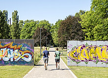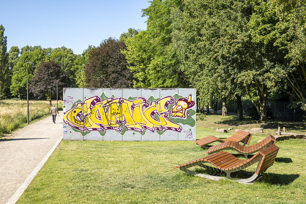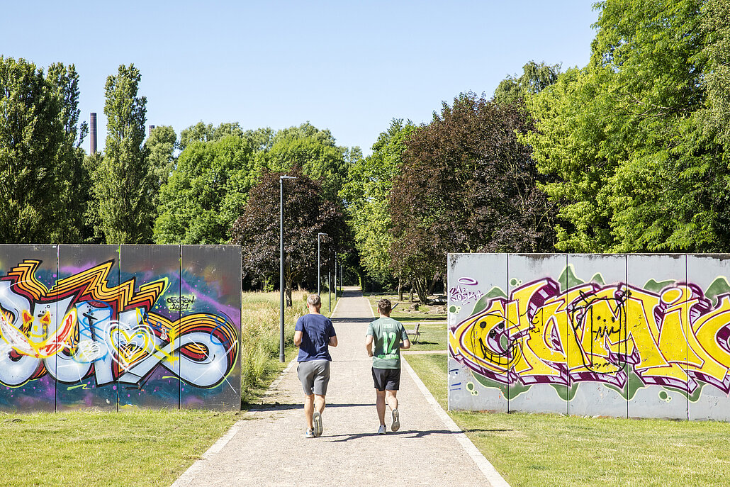 Die barrierefreien Wege verbinden unterschiedliche Erlebnisorte im ganzen Park miteinander. Von der Wassererlebnisachse über den Naturspielplatz mit Grünem Klassenzimmer über das Urban Gardening hin zur Obstwiese mit Beerensträuchern und den verschiedenen Sportangeboten gibt es viel zu entdecken.