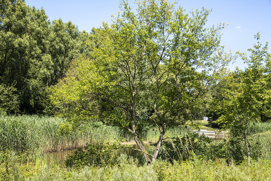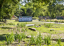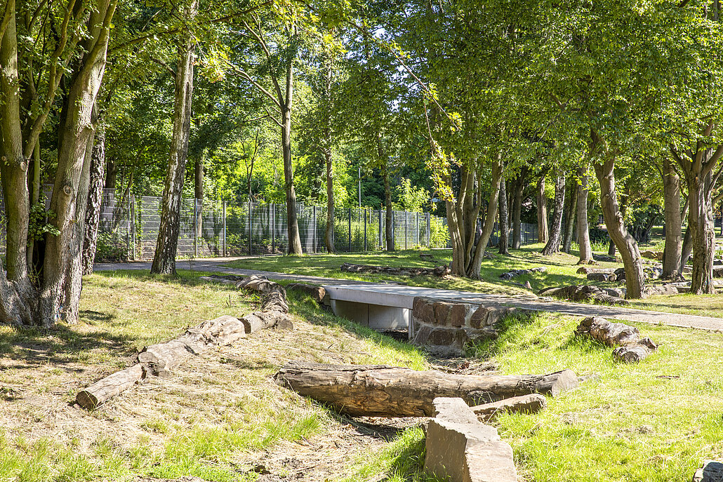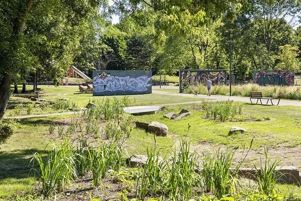 Der Park ist ein wichtiger Bestandteil für die natürliche Ableitung von Regenwasser, das hier nicht in die Kanalisation fließen muss. Die Wassererlebnisachse und die drei Entdeckerorte zum Thema Klima und Natur machen die Wege des Wassers sichtbar und erlebbar: mit kleinen Naturspielelementen, interaktiven Stationen, kleine Infotafeln, Sitzgelegenheiten und einer Erweiterung des Entwässerungssystems.