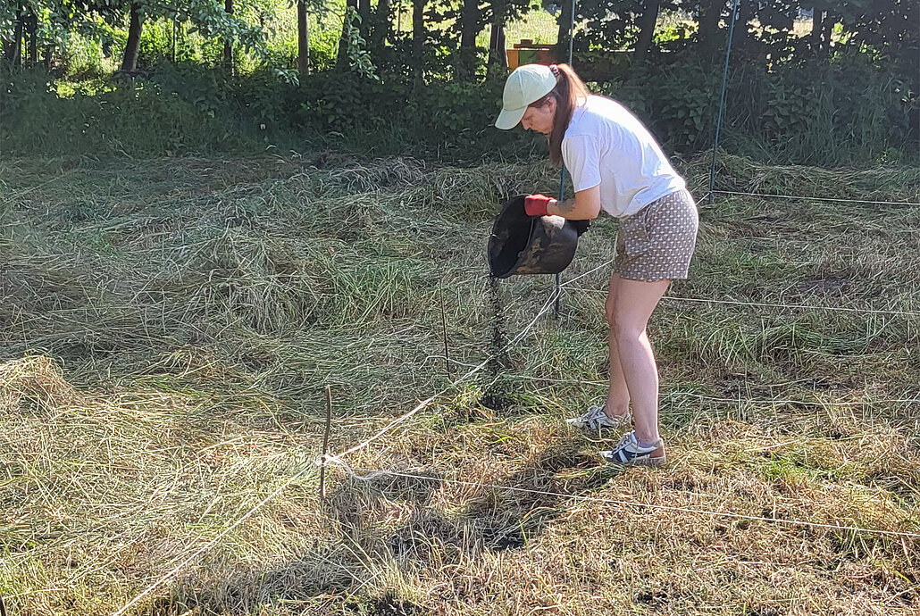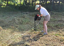 Auf einer extensiv genutzten Wiese wird halbjährlich Pflanzenkohle oberflächlich ausgebracht, ohne die Grasnarbe zu zerstören. Diese Maßnahme zielt darauf ab, den Einfluss der oberflächlichen Ausbringung von Pflanzenkohle auf die Sickerfähigkeit des Bodens sowie auf die Biodiversität zu analysieren.