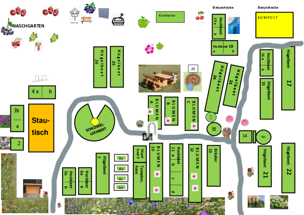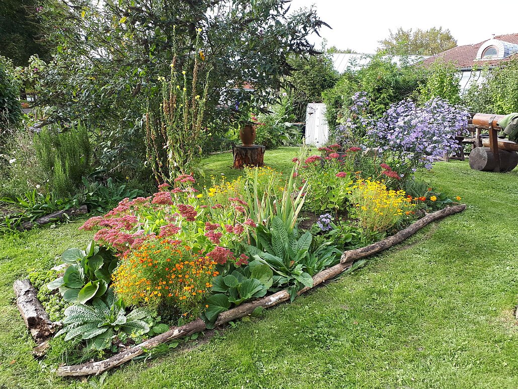 Im Garten befinden sich neben Hoch- und Hügelbeeten auch spezielle Beetformen wie z.B. das Schlüssellochbeet oder die Kräuterspirale mit ihren speziellen Zielsetzungen. Die Benjeshecke, das Wildbienenhotel und der Käferkeller locken Insekten, Käfer und Säugetiere an und bieten ihnen einen artgerechten Lebensraum.