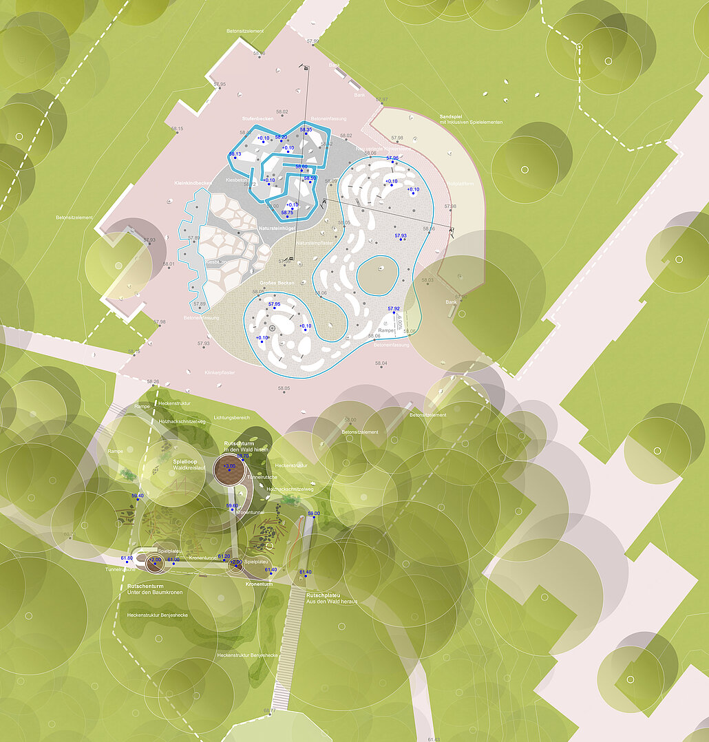 Das Areal wird um einen neuen Waldspielplatz erweitert, der die Nutzzeit des Spielplatzes auf das ganze Jahr ausdehnt, also auch außerhalb der warmen Monate, wenn der Wasserspielplatz in Pause geht. Der Waldspielplatz vermittelt Themen der Umweltbildung als spielerische Erfahrung des Waldes und der Natur. Im Rahmen der Maßnahme wird zudem die bestehende, angrenzende Toilettenanlage ertüchtigt.