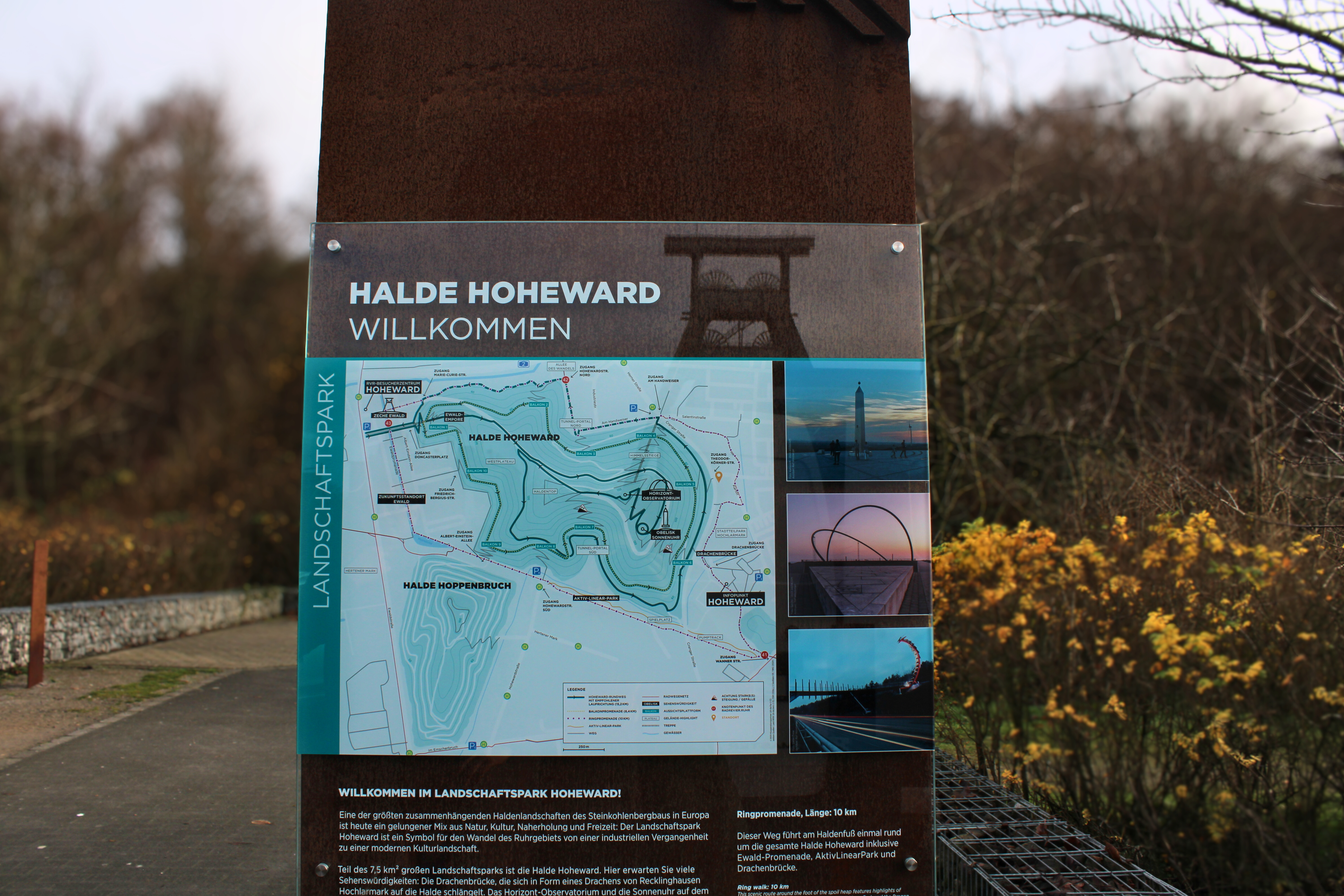 In den vergangenen Monaten wurden mehr als 100 neue Stelen aus Cortenstahl als Hommage an die Industriegeschichte der Halde aufgestellt und mit Schildern versehen. Diese informieren auf Deutsch und Englisch z. B. über das Horizontobservatorium, die Sonnenuhr, den Landschaftspark Hoheward und generell über Halden, ergänzt durch Karten, Grafiken und Fotos. Die Halde Hoheward im Kreis Recklinghausen gehört zu den größten und am stärksten besuchten Halden im Besitz des Regionalverbandes Ruhr (RVR).