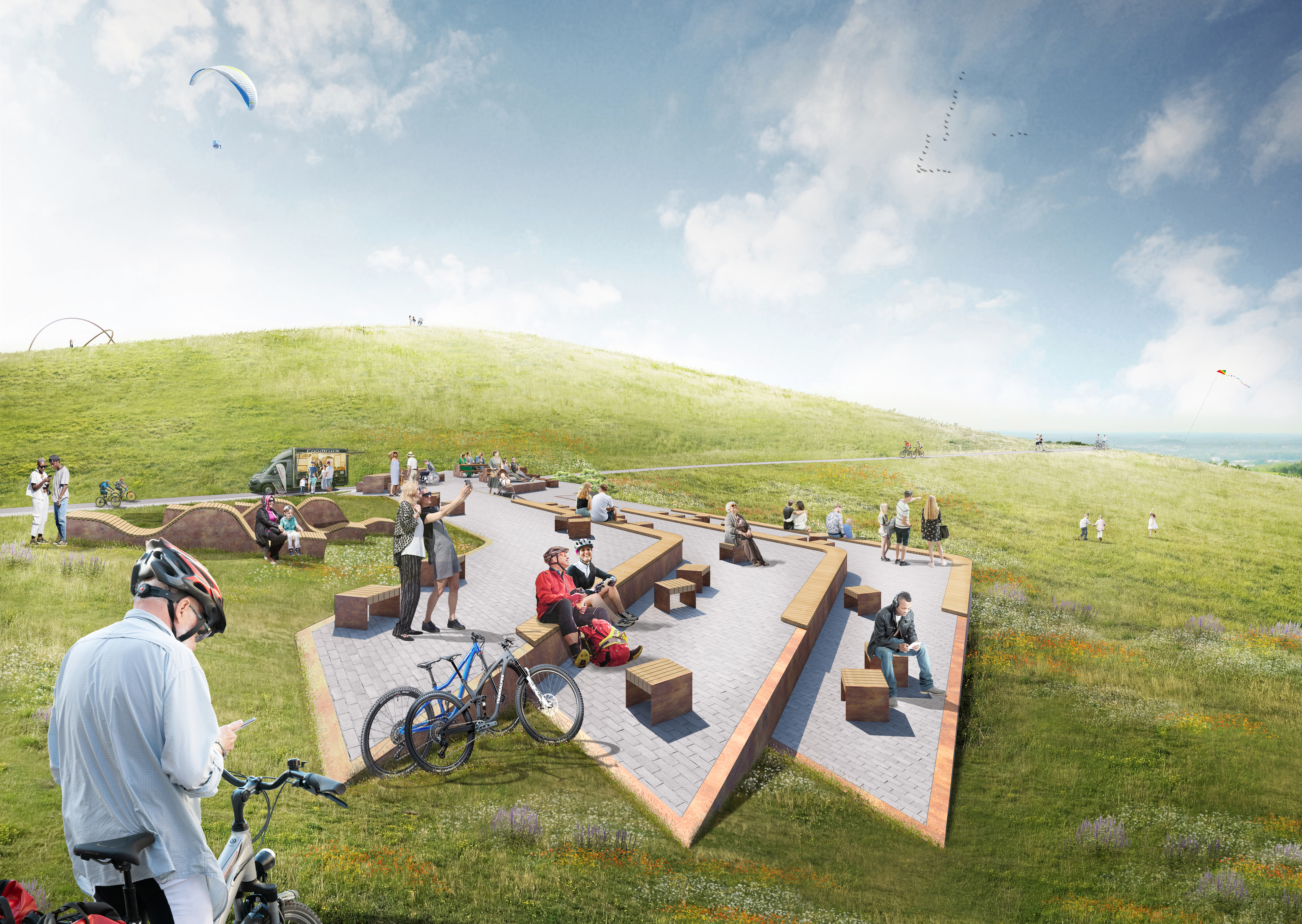 Ergänzend zum Ausbau der Mountainbike-Strecken entsteht mit dem halden.spot ein neuer Aufenthaltsbereich auf dem Westplateau der Halde. Der rund 400 Quadratmeter große, terrassierte Platz wird mit verschiedenen Sitzmöglichkeiten ausgestattet – darunter Picknick-Tische, Sitzwürfel und Wellenliegen – und schafft neue Aufenthalts- und Verweilmöglichkeiten für Besucher:innen.
