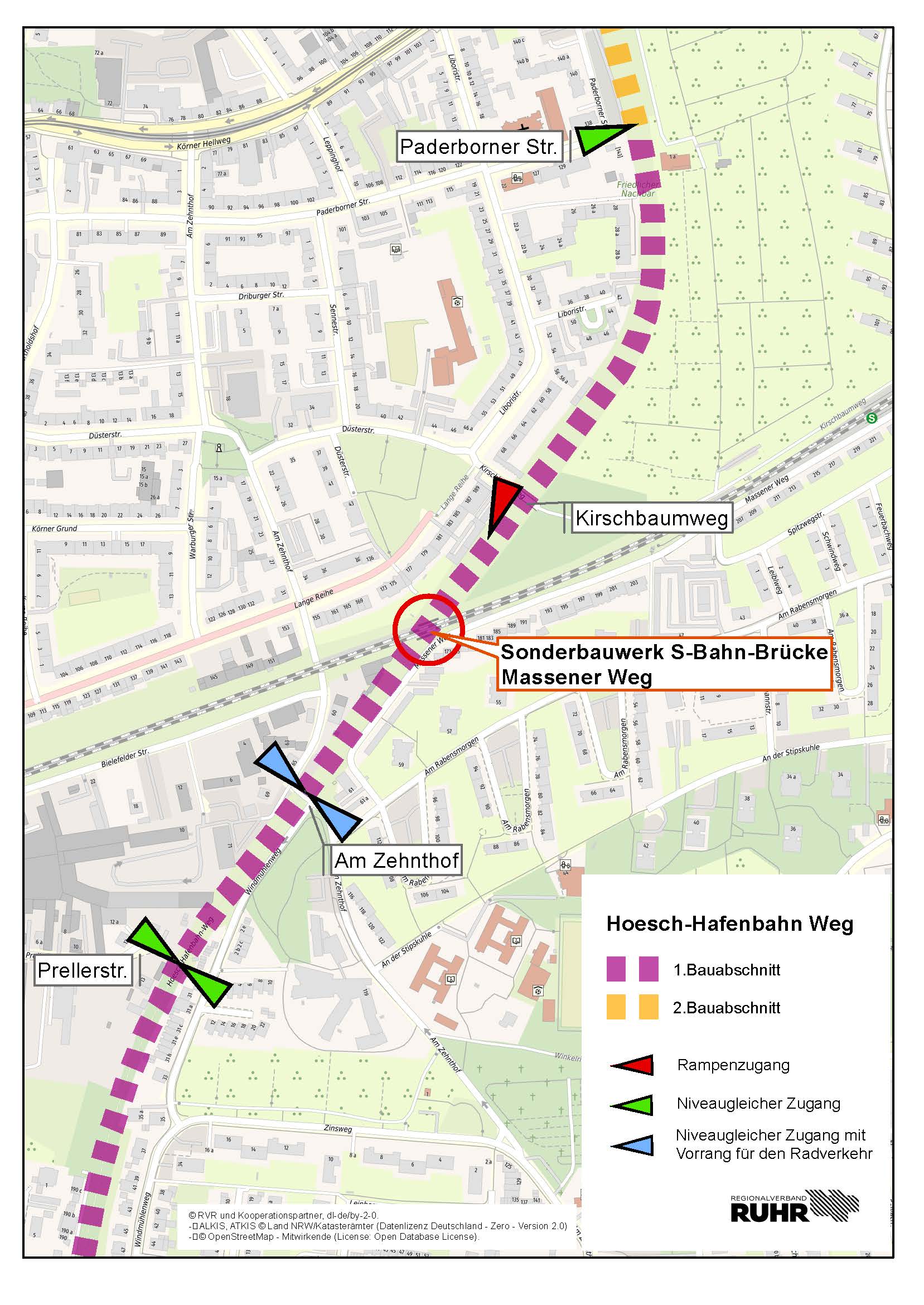 Die S-Bahn-Brücke Massener Weg stellt die Unterquerung des zukünftigen Hoesch-Hafenbahn-Radweges unter der S-Bahn-Strecke sicher. Aufgrund erheblicher Schäden musste die 1929 erbaute Brücke ersetzt werden. Während die DB das Neubauprojekt umsetzte, kommt der RVR für die Kosten auf – mit Fördermitteln des Ministeriums für Umwelt, Naturschutz und Verkehr (MUNV, Düsseldorf). Seit Mitte Dezember 2024 ist die neue Brücke wieder in Betrieb.