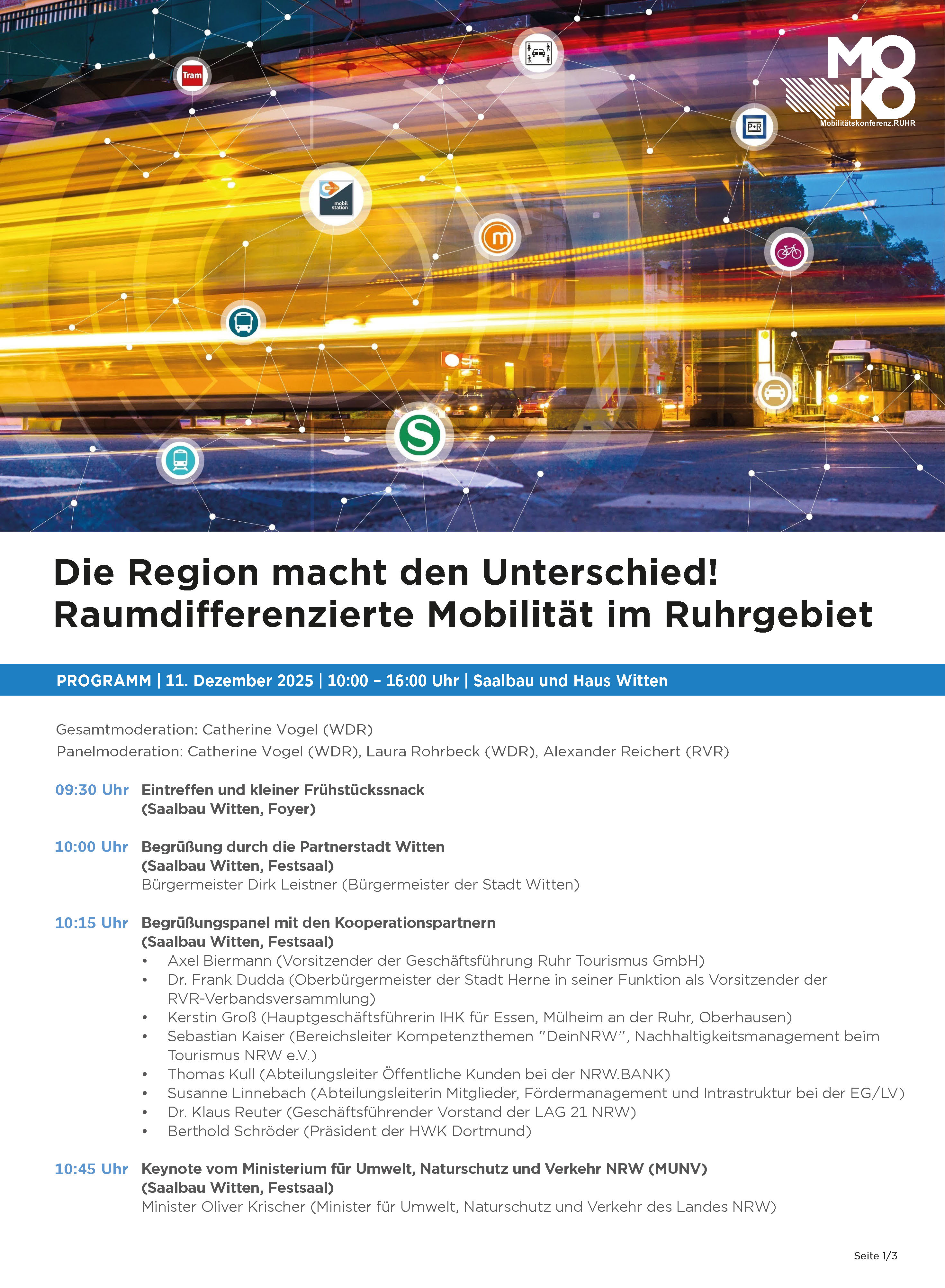 Die Konferenz findet am 11. Dezember 2025 in der Zeit von 10:00 Uhr bis 16:00 Uhr im Saalbau und Haus Witten statt. Die MOKO, die der Regionalverband Ruhr unter der Schirmherrschaft des Ministeriums für Umwelt, Naturschutz und Verkehr des Landes NRW organisiert, hat sich in den letzten Jahren als zentrale Fach- und Netzwerkveranstaltung für Mobilitätsthemen im Ruhrgebiet etabliert.