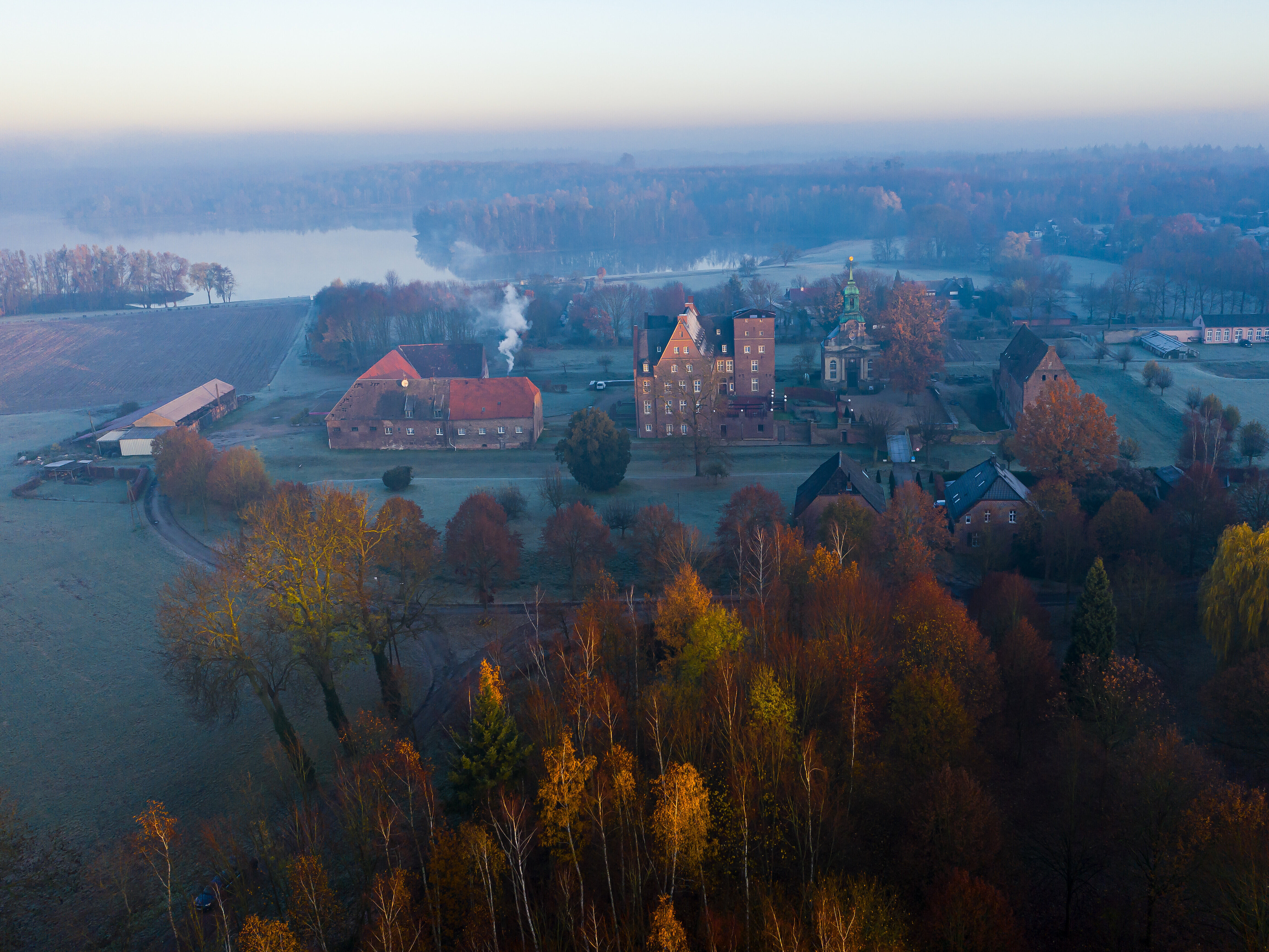 Kiefernwald in der Haard im nördlichen Ruhrgebiet mit trockenem Untergrund und verwelkten Blättern an Bäumen