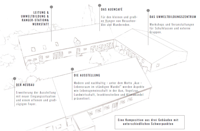 Alle drei Gebäude sollen umgebaut werden. Da der Betrieb des NaturForums jedoch während der Umbauzeit weiter gehen soll, wird der Umbau in drei Bauabschnitten erfolgen. So steht immer mindestens ein Gebäude zur Verfügung – für die Mitarbeitenden, aber natürlich auch für die Gäste. Auch die Veranstaltungen werden nahezu alle weiterlaufen.