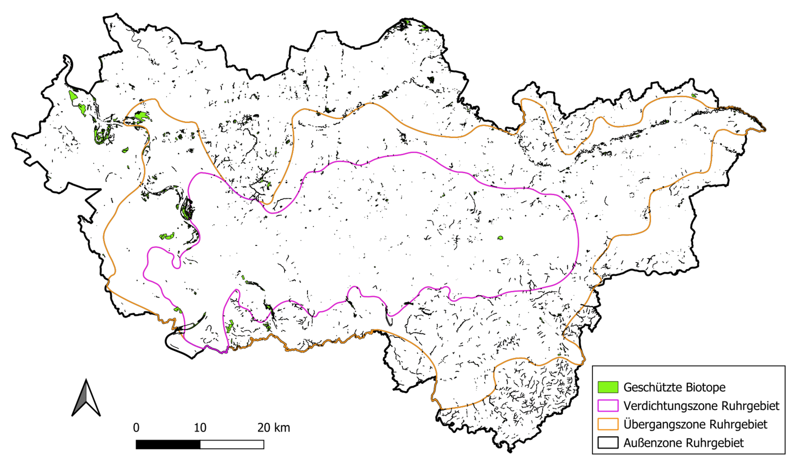 Die gesetzlich geschützten Biotope nach BNatSchG § 30 machen mit 5.975 ha 1,35 % der Gesamtfläche des Ruhrgebiets aus. Dies ist ein vergleichbarer Wert zu den 1,54 % im gesamten Land NRW. In der Außen- und Übergangzone, also den teils oder stark ländlich geprägten Bereichen des Ruhrgebiets, ist der Anteil dabei deutlich höher als in der Verdichtungszone.