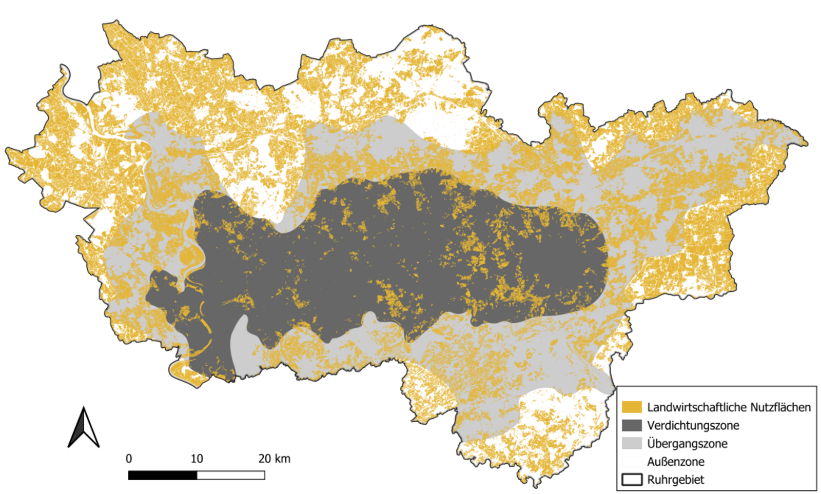 Landwirtschaftliche Nutzflächen gehören mit über einem Drittel Anteil an der Gesamtfläche zu den wichtigsten Flächennutzungstypen im Ruhrgebiet. Ein Großteil dieser Flächen liegt in der Übergangs- und Außenzone des Ruhrgebiets. Im östlichen sowie vor allem im nordwestlichen Ruhrgebiet gibt es besonders viele landwirtschaftliche Flächen.