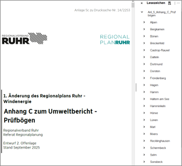 Nachdem die Verbandsversammlung bereits am 13.12.2024 (DS-Nr. 14/1759) den Aufstellungsbeschluss und den Beschluss für die erste Beteiligung zur 1. Änderung des RP Ruhr gefasst hat, hat die Verbandsversammlung nunmehr am 10.10.2025 (Drucksache Nr.: 14/2253) die Durchführung einer zweiten uneingeschränkten Beteiligung der Öffentlichkeit und der in ihren Belangen berührten öffentlichen Stellen (einschließlich der Verfahrensbeteiligten) i.S.d. § 9 ROG beschlossen. Sie hat die Regionalplanungsbehörde beauftragt, diesen Verfahrensschritt durchzuführen.